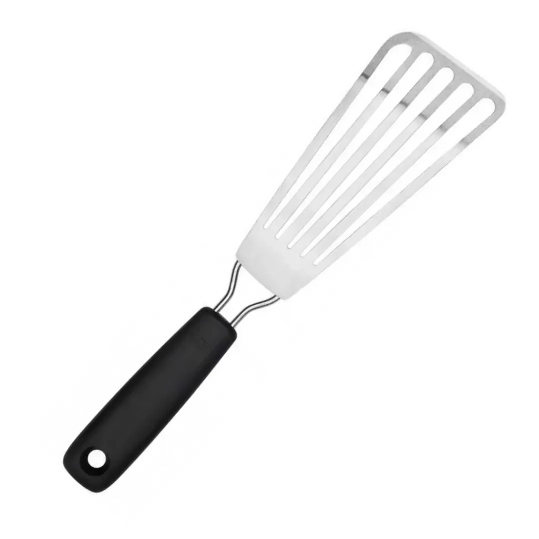 Een visspatel is een platte, vaak iets gebogen keukentool met een flexibele kop en lange sleuven. Deze gleuven zorgen ervoor dat overtollig vet of vloeistof wegloopt terwijl je de vis omdraait. Het materiaal is meestal van kunststof, siliconen of RVS. De vorm van een visspatel is perfect afgestemd op het oppakken en draaien van kwetsbare producten zoals visfilets.